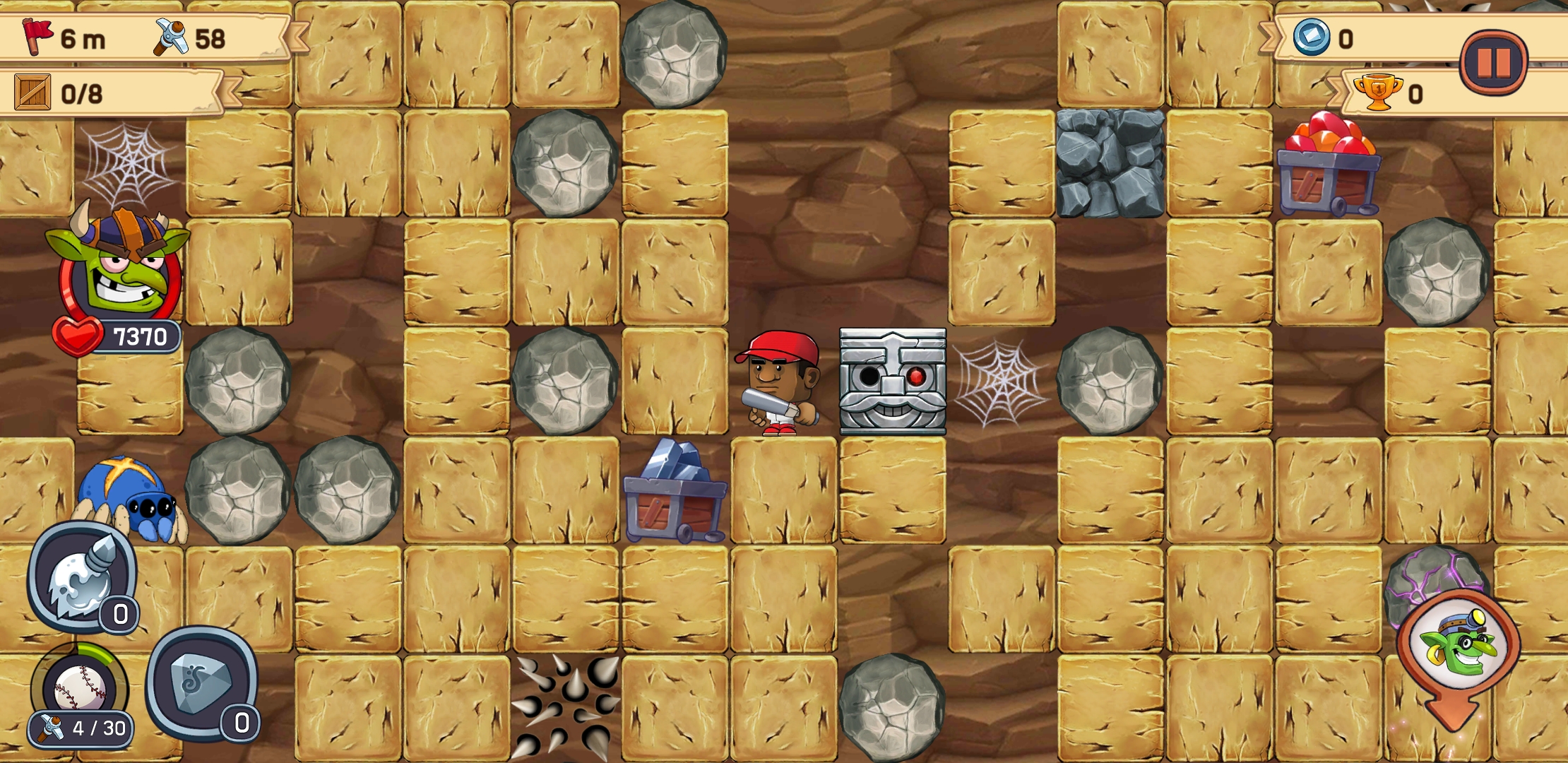 곡괭이가 횟수가있어 곡괭이를 다쓰거나 몬스터에 공격당하거나 돌멩이에 깔리면 죽게되구요 가끔를 레이저를 쏘는 장애물이나 폭탄에 죽기도하더라구요