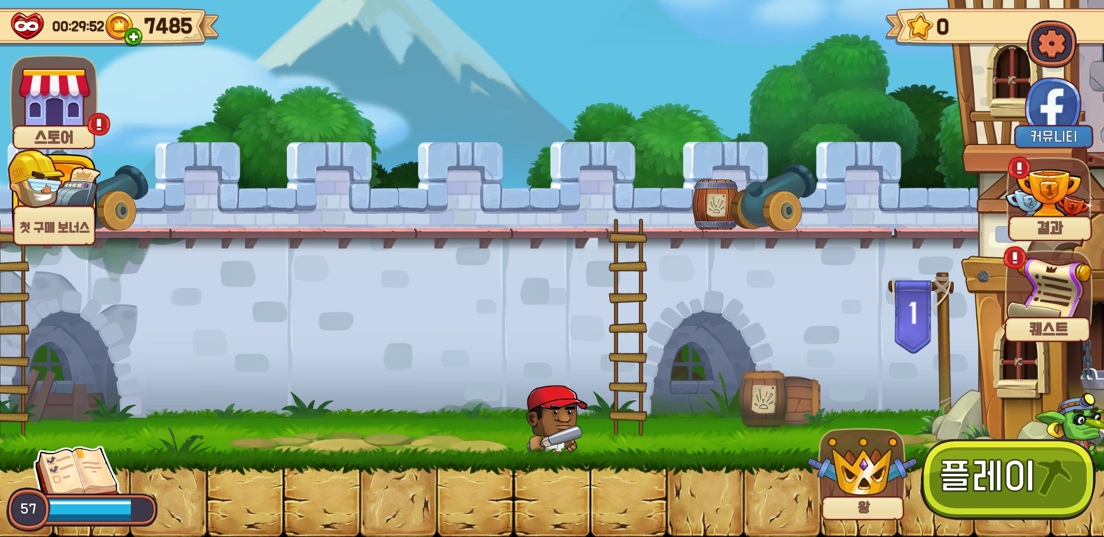 게임의 메인화면 매일 일퀘스트가 있고 매주 결과가 측정되어 돈이나 경험치가 추가됩니다. 경험치가 채워지면 별을 주고요 메인케스트를 깰 수 있게 됩니다.