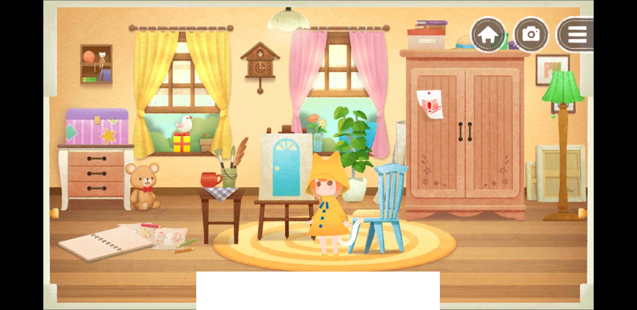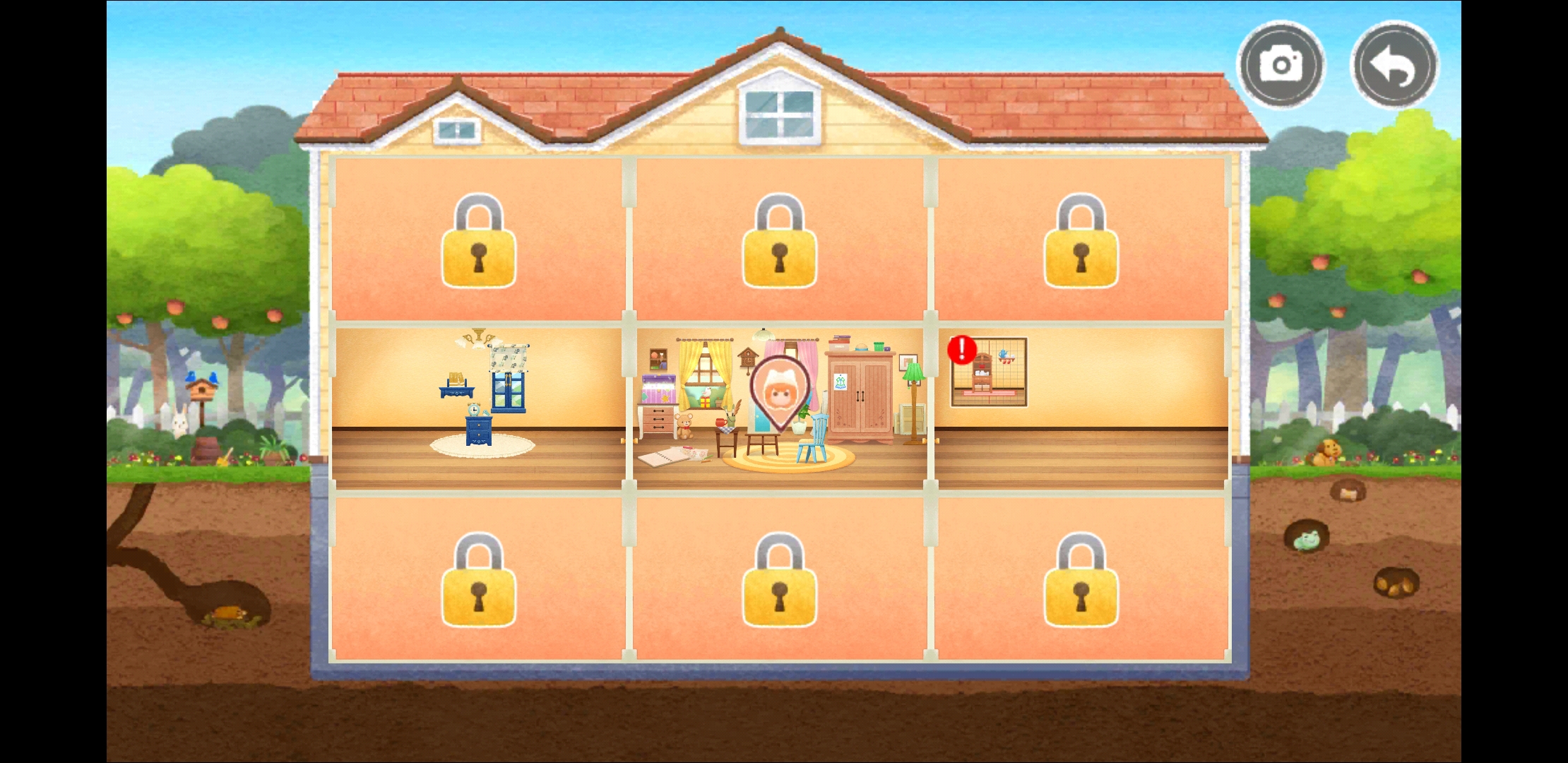 게임의 메인화면이에요 첨에는 튜트리얼이 진행되고 이맵으로 이동되죠 중간에 문으로 들어가면 게임의 시작, 옷장을 클릭하면 주인공의 옷변경, 창문에 새 아래에 선물상자를 클릭하면 메일 수신, 왼쪽에 보라색상자는 스테이지를깨고 모으는 컬렉션이 모여있어요~~