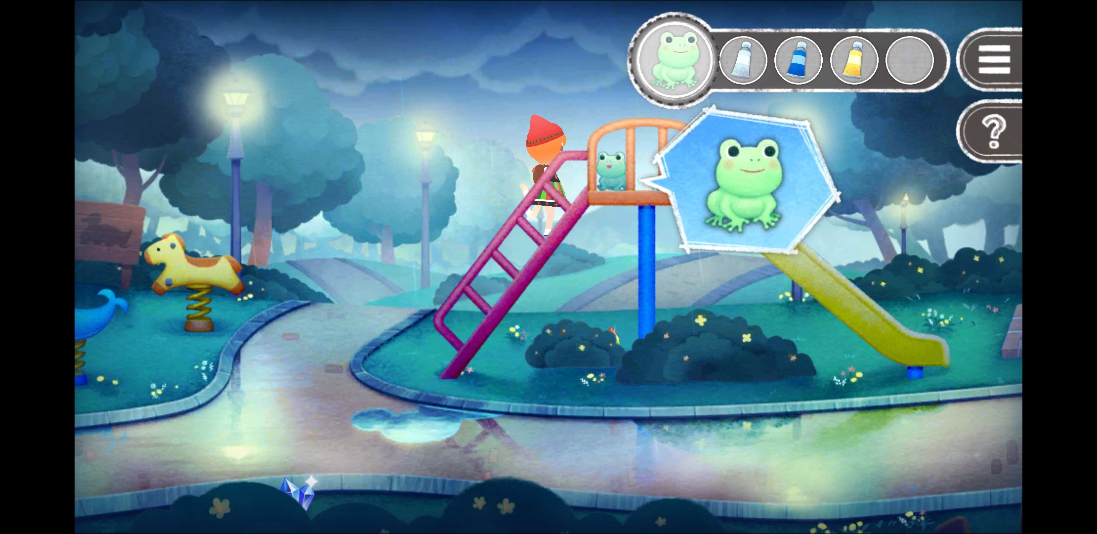 네번째 마지막 물감을 엄마 개구리한테 아기 개구리를 찾아다 주는거에요. 아기 개구리는 백조모양 배 아래에 흰 기둥뒤에 숨어있구요. 엄마 개구리는 미끄럼틀 위에 대기하고 있으니 데려다 주면 물감을 주워요. - 노랑 물감 Get!!
