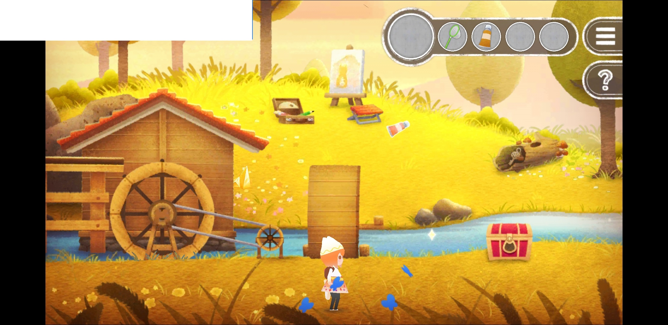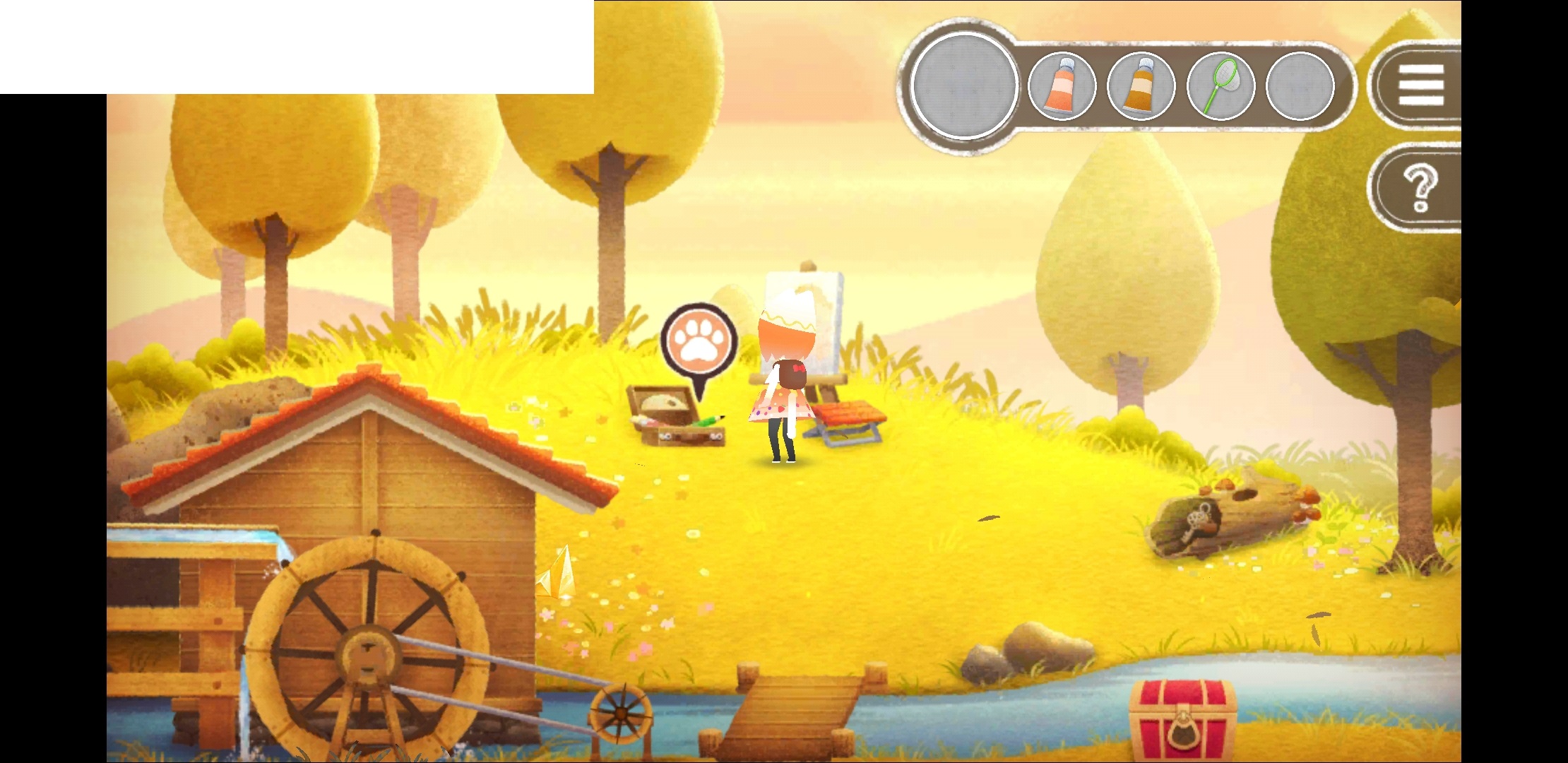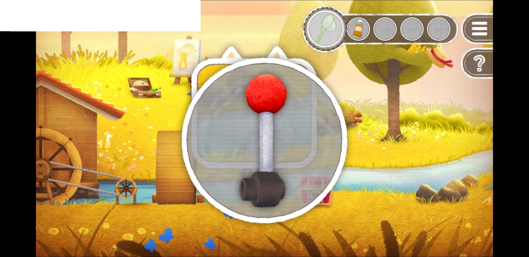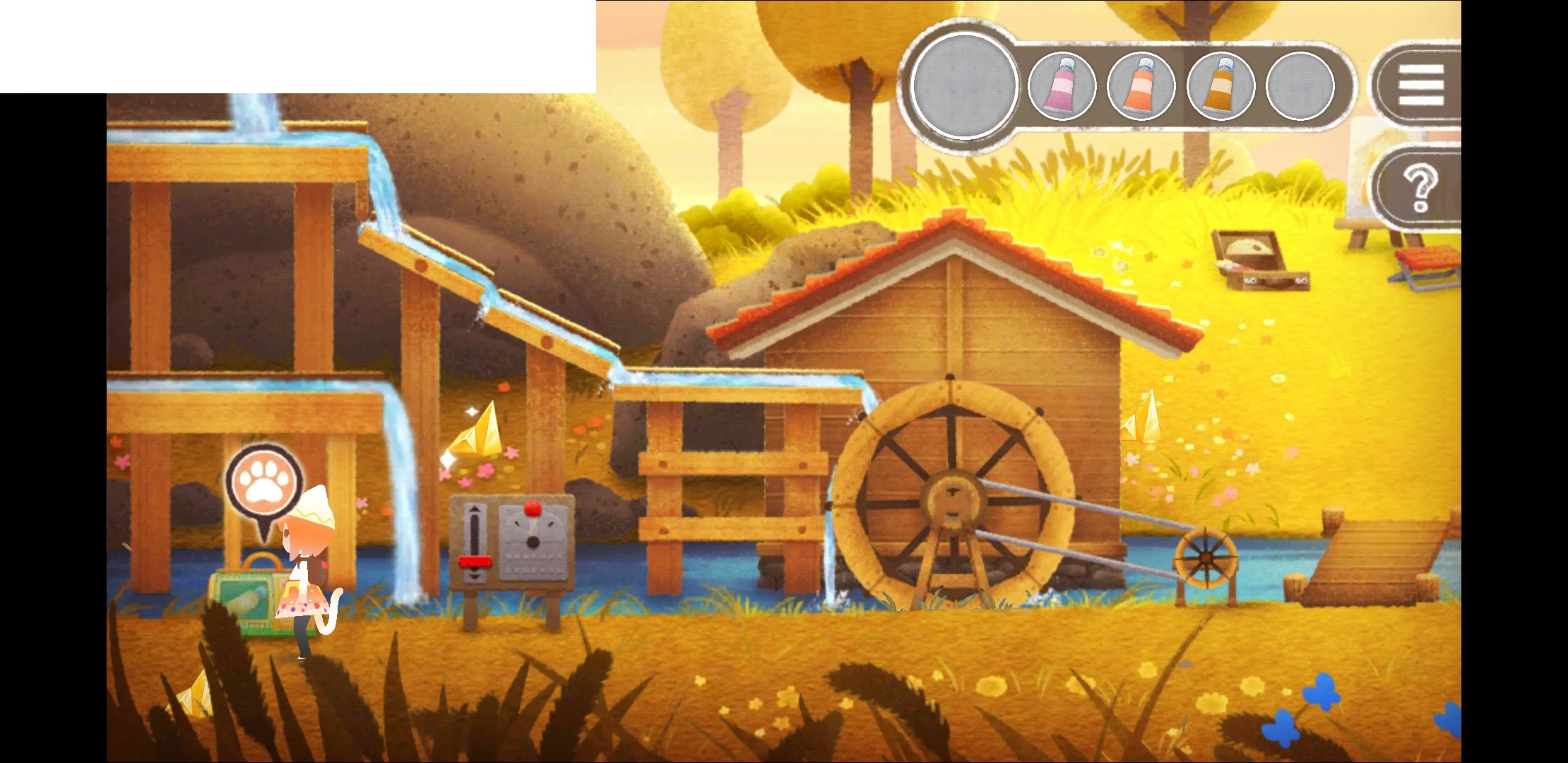 두번째 물감은 물레방아의 물을 아래까지 내리면 되는데요. 채집채를 획득하고 그거로 시냇물에 반짝이는 물건을 획득하면 손잡이를 얻을수 있구요 그거로 물레방아를 컨트롤해서 왼쪽 손잡이를 위로 올리면 왼쪽 물이동을 아래로 내리면 오를쪽 물이동을 할 수 있어요. 이동이 완료되면 물레방아 오른쪽에 다리가 내려오고 건너가면 두번째 물감을 GET!!!