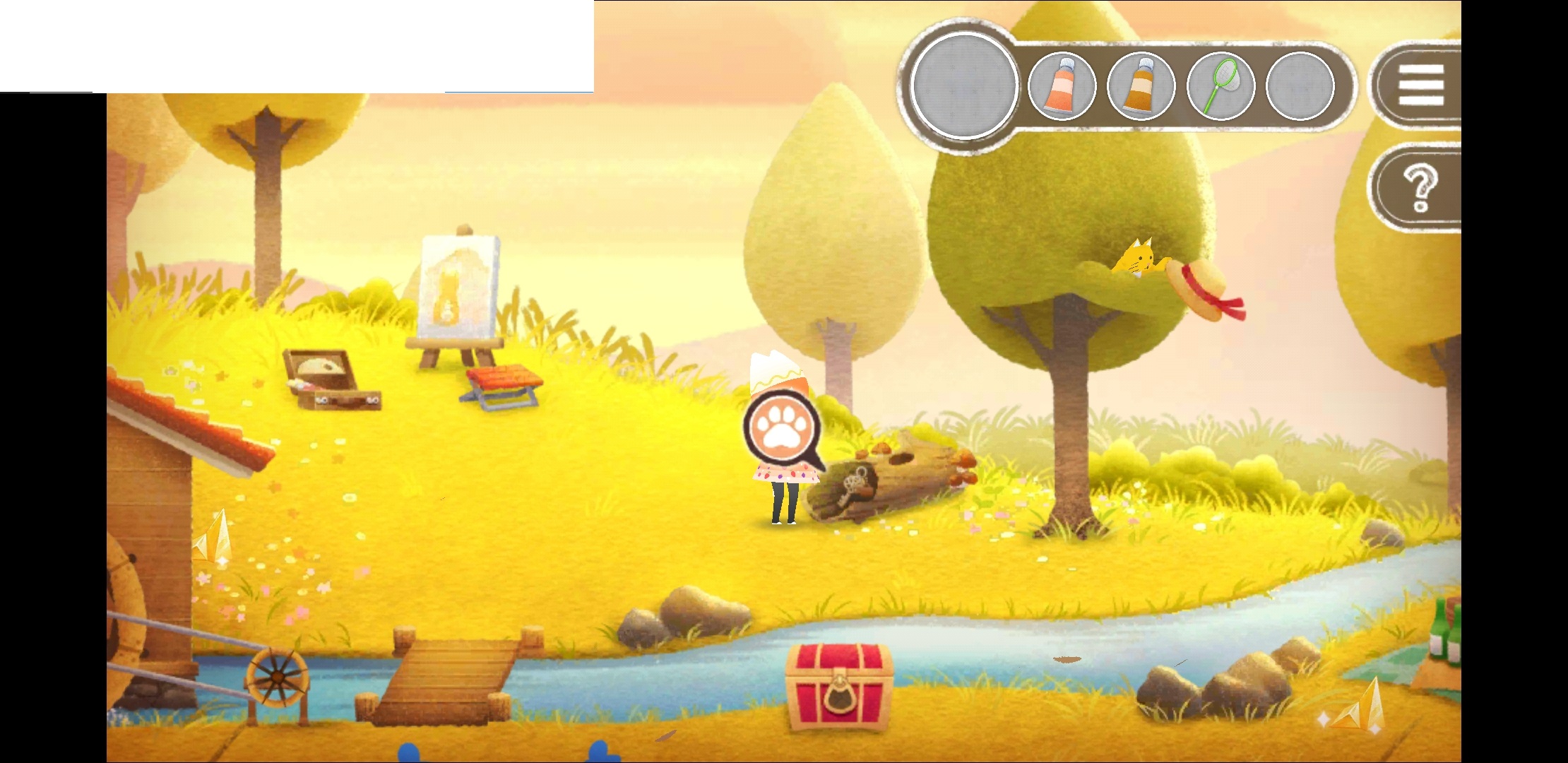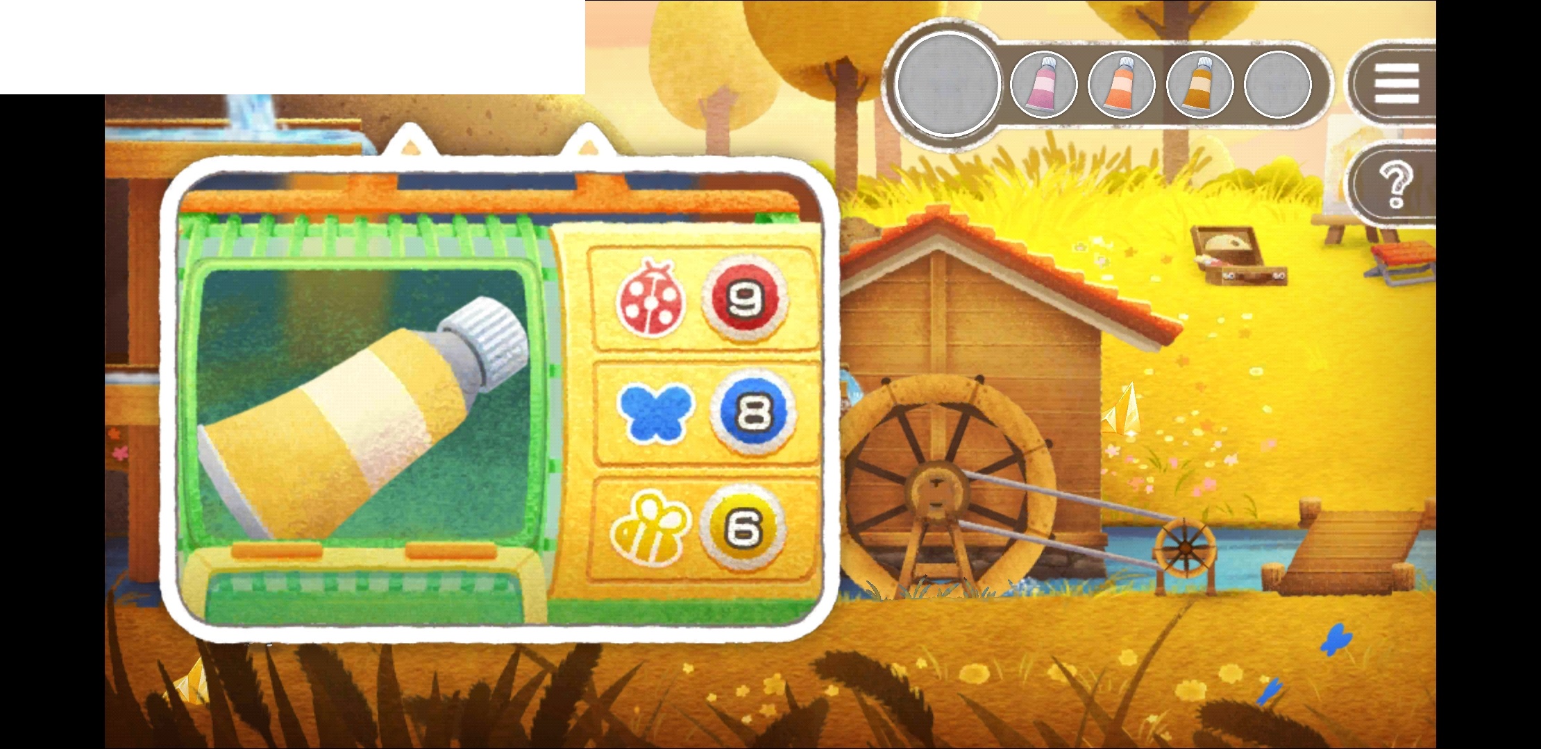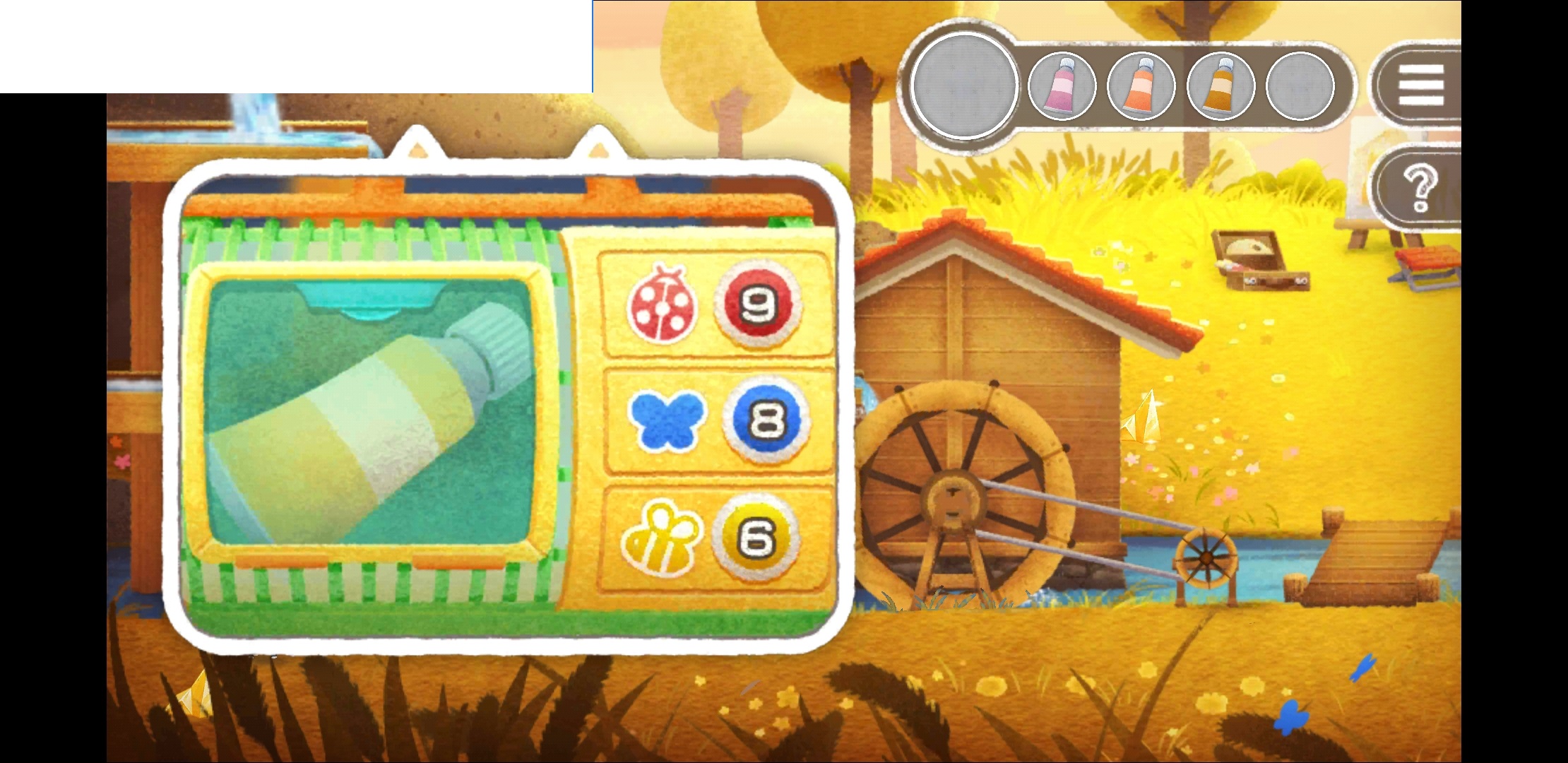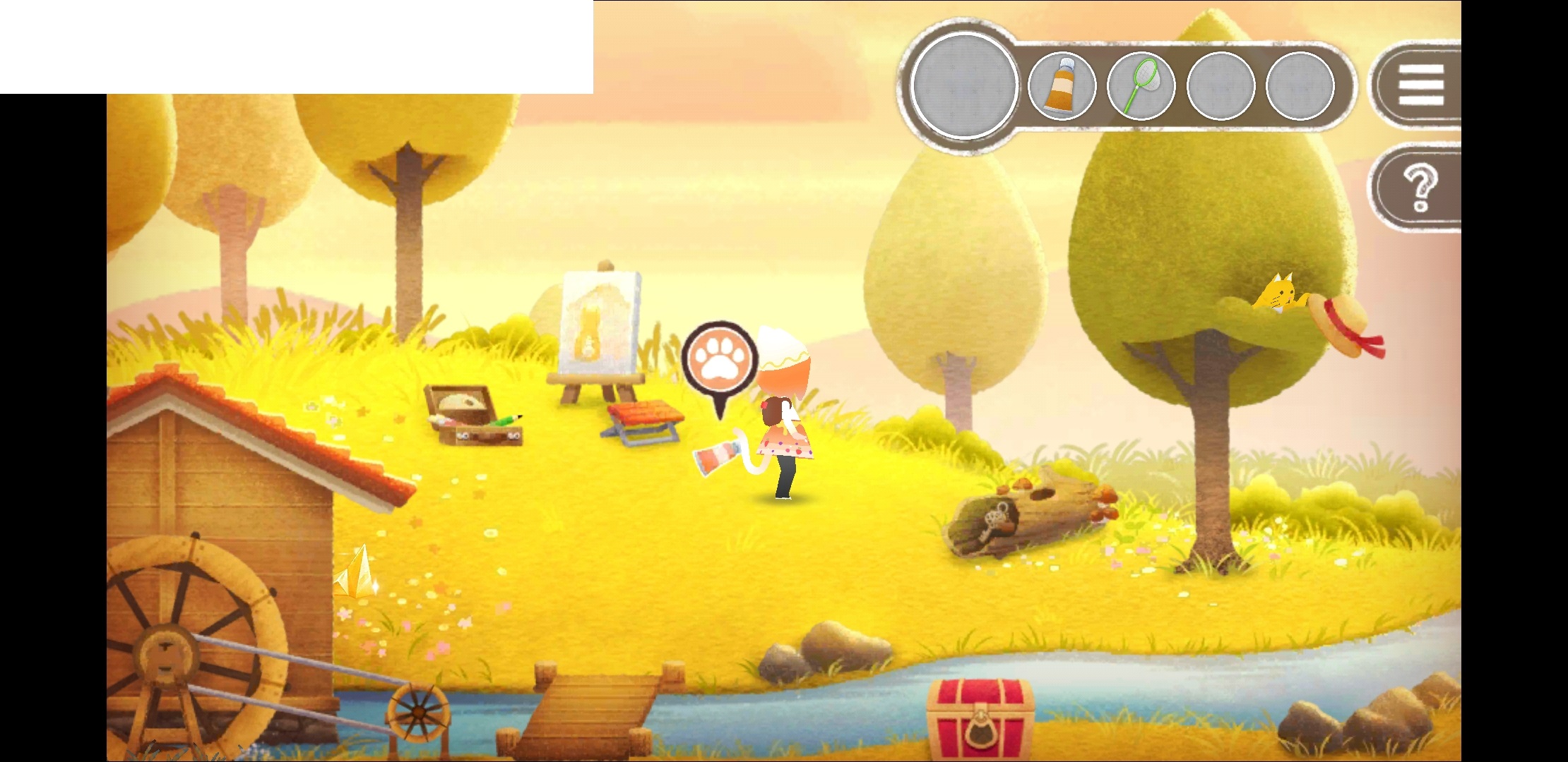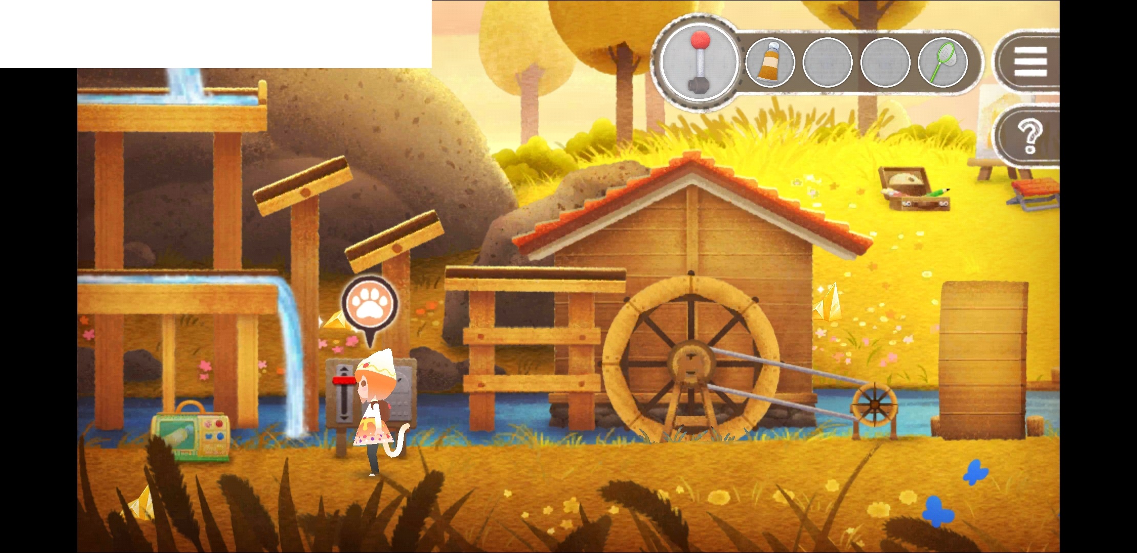 두번째 물감은 물레방아의 물을 아래까지 내리면 되는데요. 채집채를 획득하고 그거로 시냇물에 반짝이는 물건을 획득하면 손잡이를 얻을수 있구요 그거로 물레방아를 컨트롤해서 왼쪽 손잡이를 위로 올리면 왼쪽 물이동을 아래로 내리면 오를쪽 물이동을 할 수 있어요. 이동이 완료되면 물레방아 오른쪽에 다리가 내려오고 건너가면 두번째 물감을 GET!!!