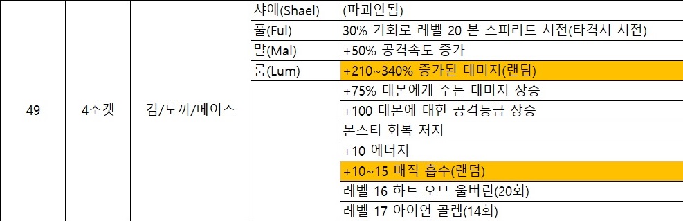 순서는 레벨, 소켓수, 재료, 룬워드, 옵션 순입니다.