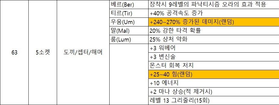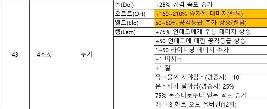 순서는 레벨, 소켓수, 재료, 룬워드, 옵션 순입니다.